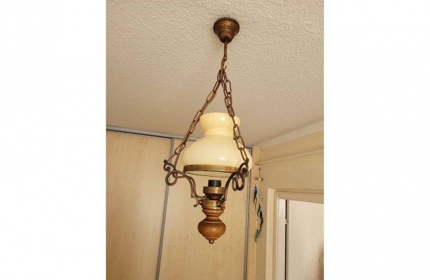Kovácsoltvas, majolika gombos, búrás, cilinderes lámpa
