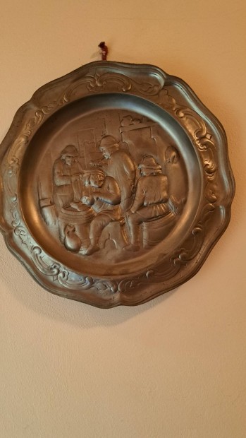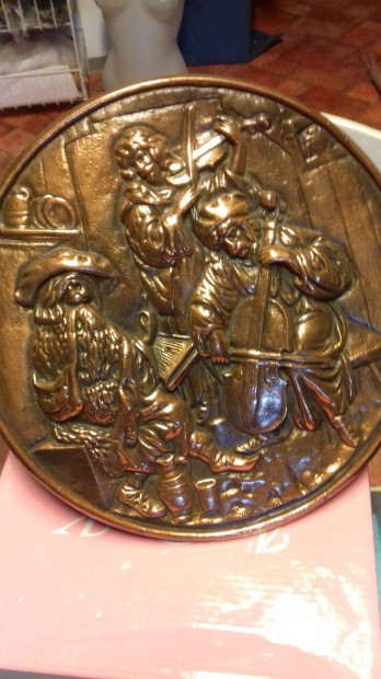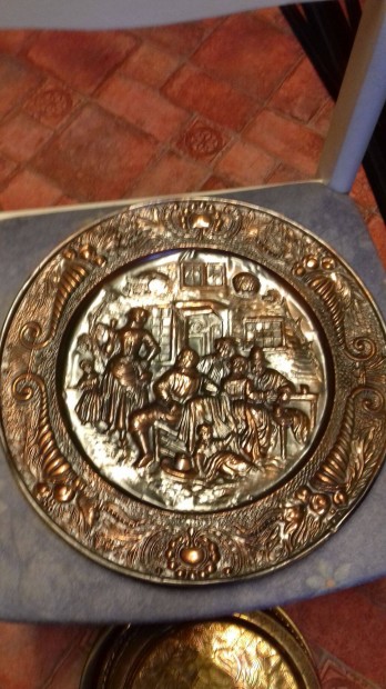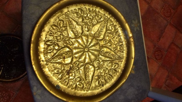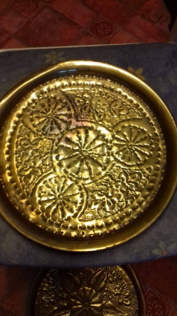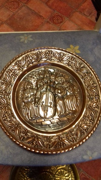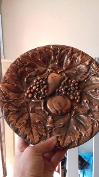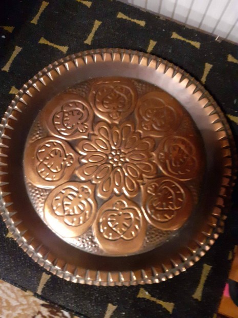 Régi vörös réz nagy fali tányér átm 30cm dombor nyomott mintázat