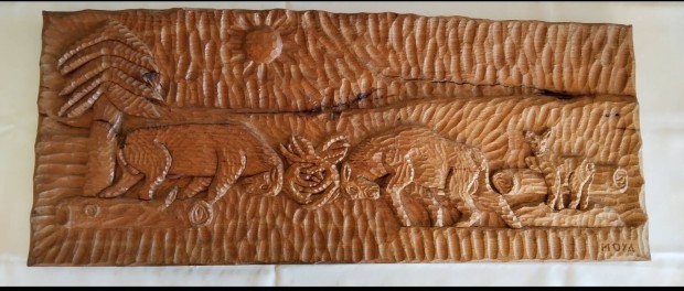 Kézzel faragott tölgyfa dombormű - küzdő szarvasbikák