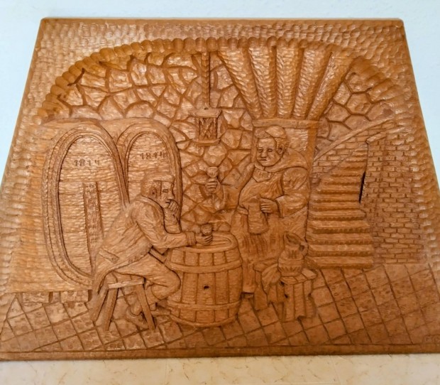 Monumentális kézzel faragott tölgyfa dombormű borospince