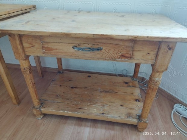 Retro keményfa faragott konyhaasztal, felújított, fiókos,polcos
