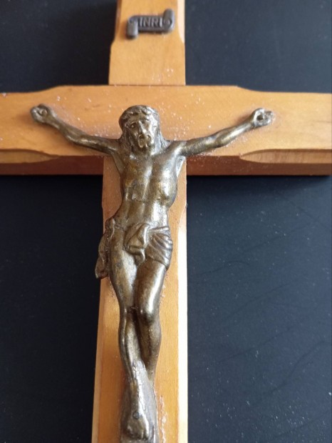 Századközepi feszület - fa kereszten sárgaréz korpusszal / 45x23 cm