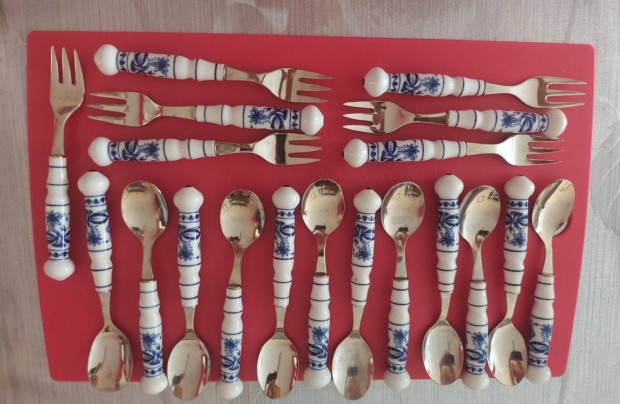Régi porcelán nyelű hagymamintás evőeszköz, kés, süteményes villa