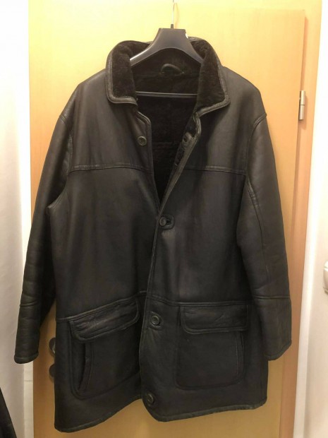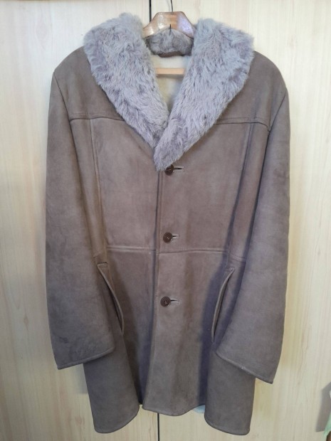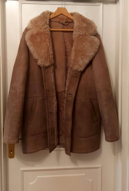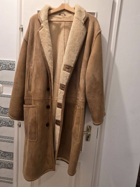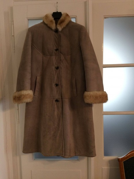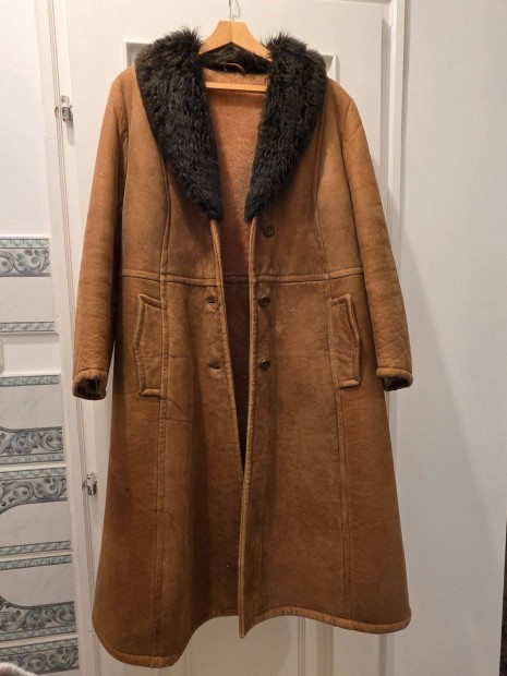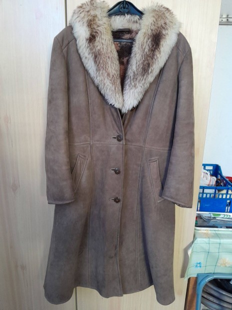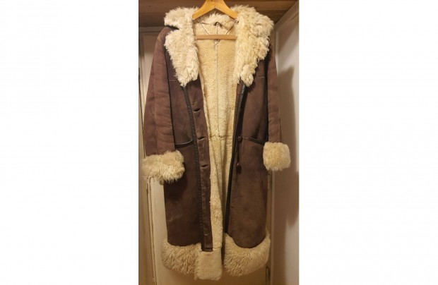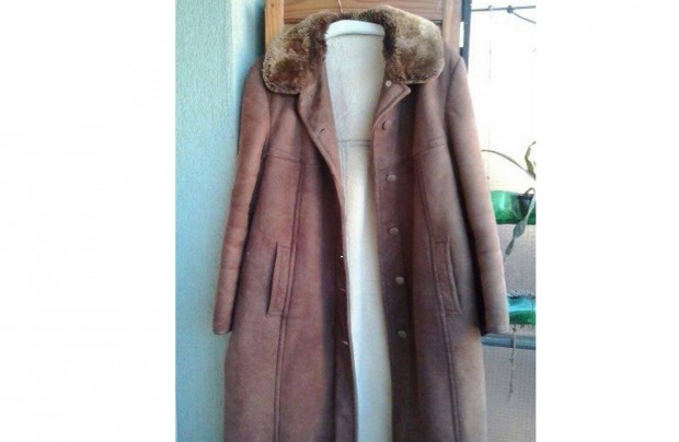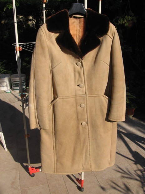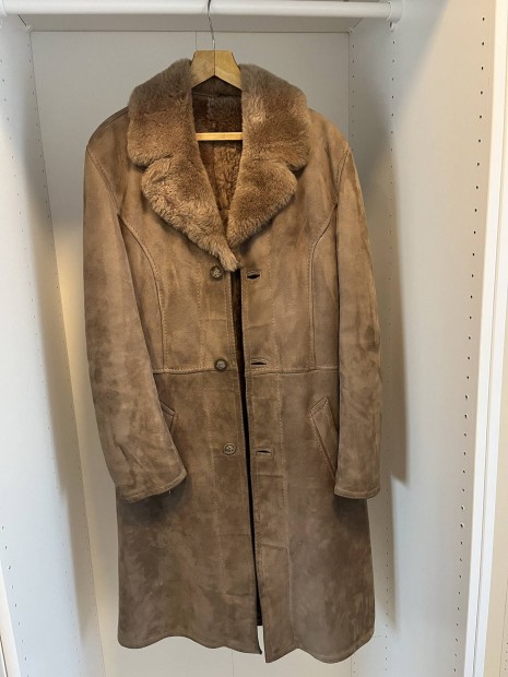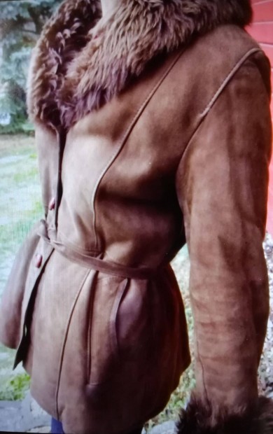Hosszú, női irhabunda övvel, szőrmegallérral