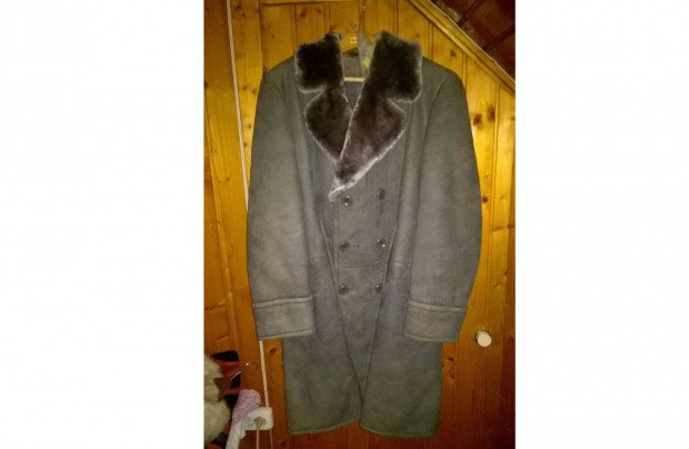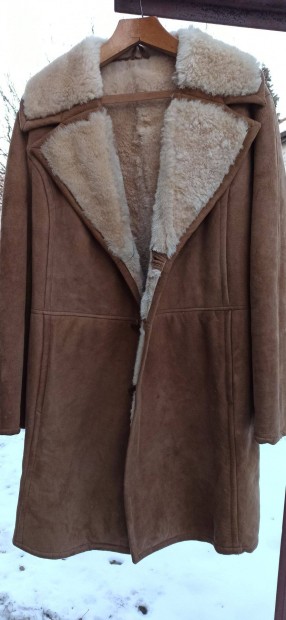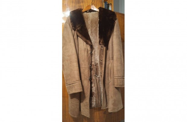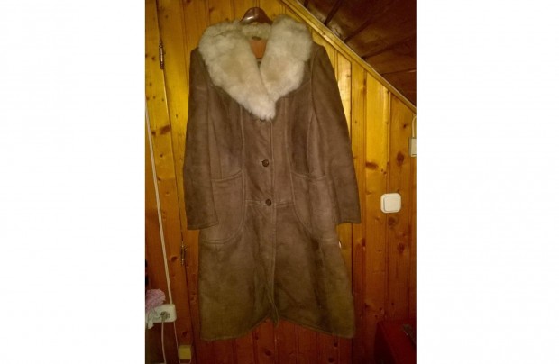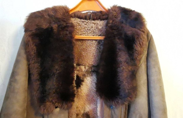 Hosszú, női irhabunda övvel, szőrmegallérral
