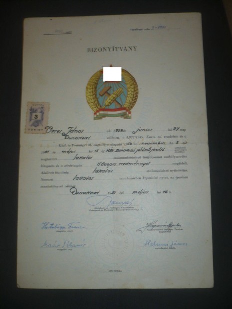 Régi rákosi máv dunakeszi járműjavító oklevél 1951