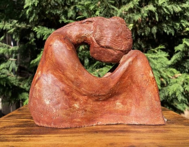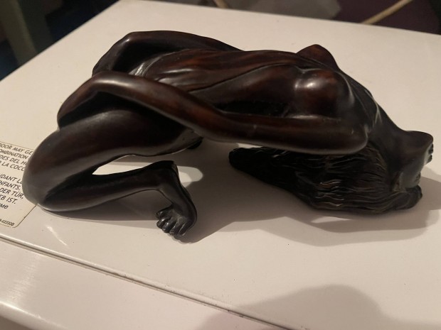 Búsuló lány kisplasztika, jelzett szobor Polyák