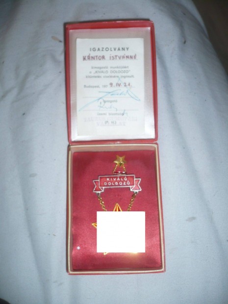 Régi kiváló dolgozó kitüntetés dobozában papírral kádár kor