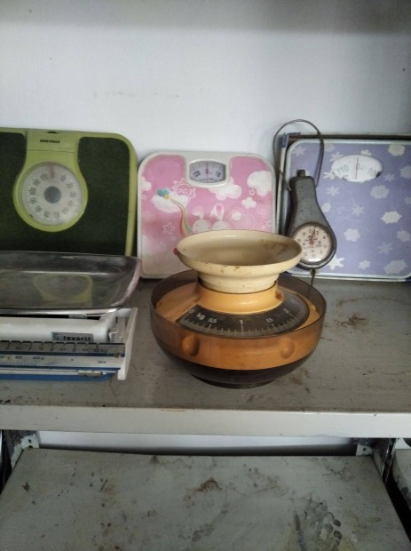 Régi Kubus konyhai mérleg réz serpenyőkkel, vintage konyhai eszköz