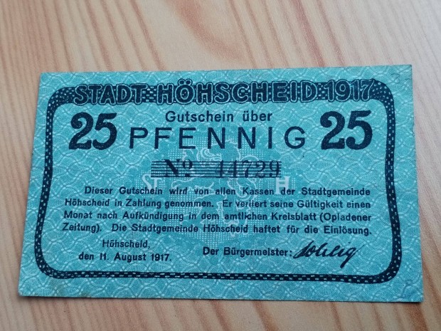 1917-es 25 pfennig Német Birodalmi Szügségpénz