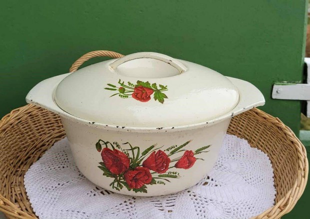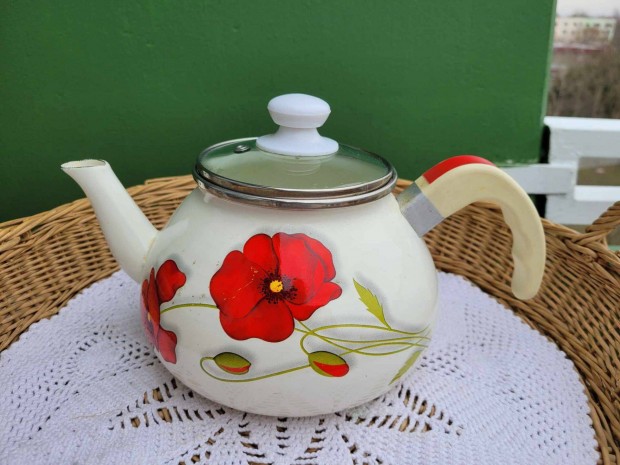 Vintage Enamel zománcos, pipacs mintás teáskanna