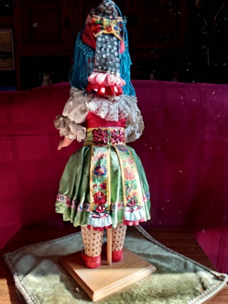 Régi antik porcelán bohóc baba kék ruhában 19. magassága 19 cm
