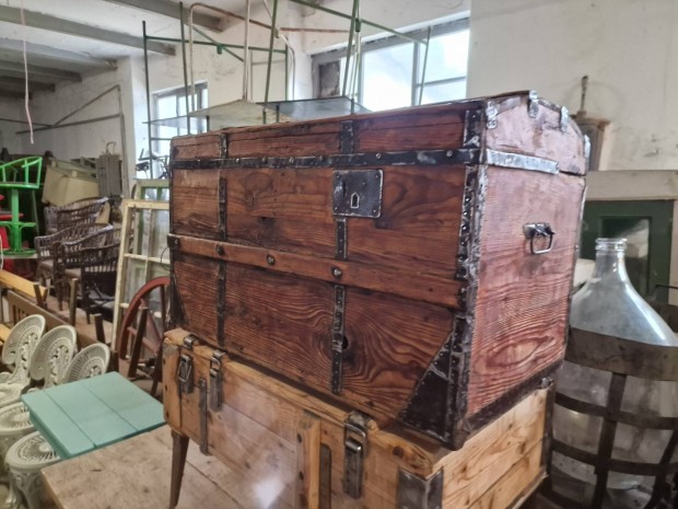 Antik nagy jelzett és számozott Ernest Hofmann régi hajókoffer láda
