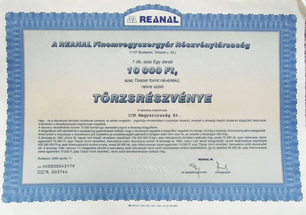 Magyar retro Reanal RT részvény 2000 osztalékszelvénnyel