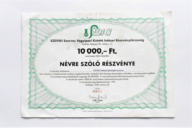 Szeviki Szerves Vegyipari Kutató Intézet RT. részvény 1995