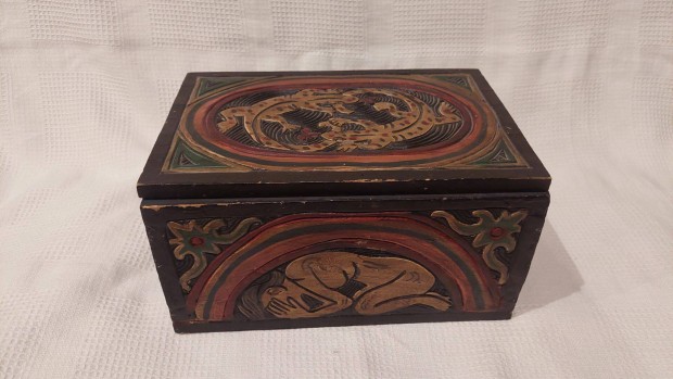 Faragott festett fa doboz szalamander figurákkal, emberábrázolással