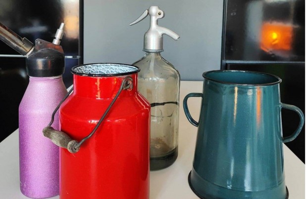 Habszifon, zsíros bödön, szódásüveg, tejeskanna