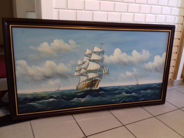 Nagyméretű festmény vászon kép tenger hajóval - dedikált