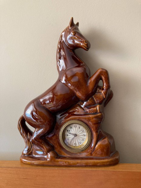 Régi art deco vekker kerámia paripa lovas asztali óra barna mázas