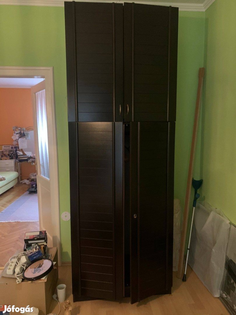 Elegáns, sötétbarna, magas szekrény eladó. Ideális ruhák, háztartási eszközök vagy iratok rendezett tárolására.
