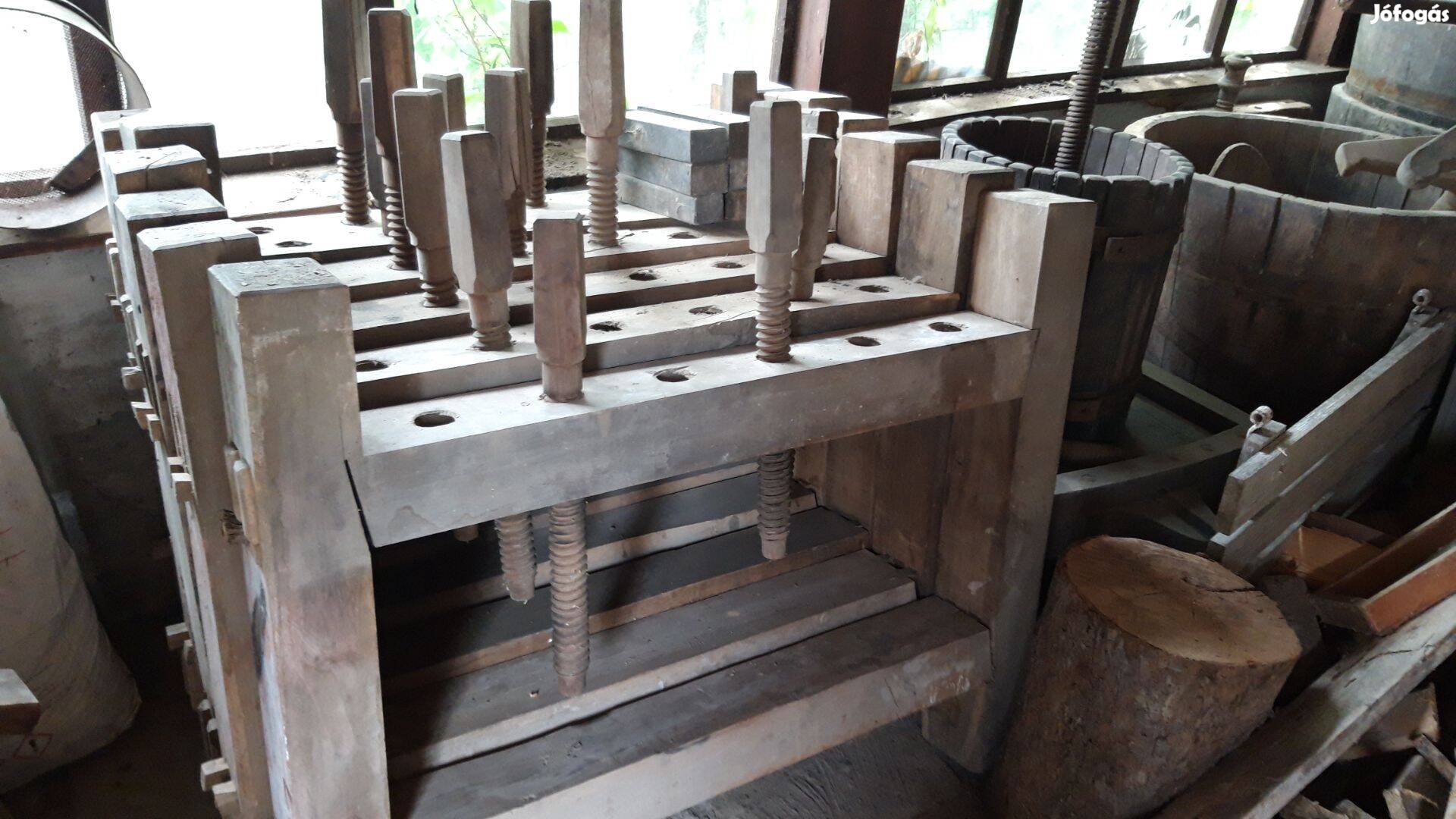 Antik szőllőprés,hat darab tölgyfából készült kisebb szőllőprés,szőllődaráló,három darab hórdóval,tartozékokkal eladó.