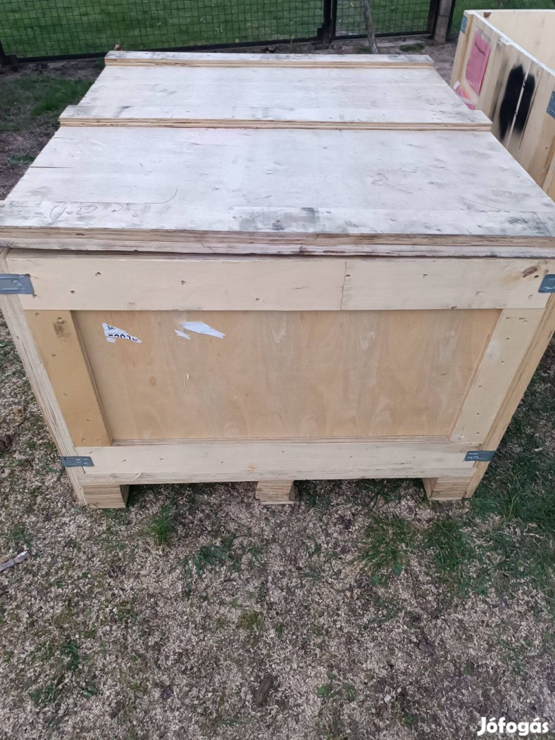 Eladó a képeken látható fa ládák(2db), tetővel együtt. Rétegelt lemezből készültek, az anyag vastagsága 16mm, a belső méretük: hosszúság 95cm, szélesség 83cm, mélysége 52cm, a teljes magassága talppal együtt 65cm. Terménynek, gabonának, magas ágyásnak, kutya háznak..