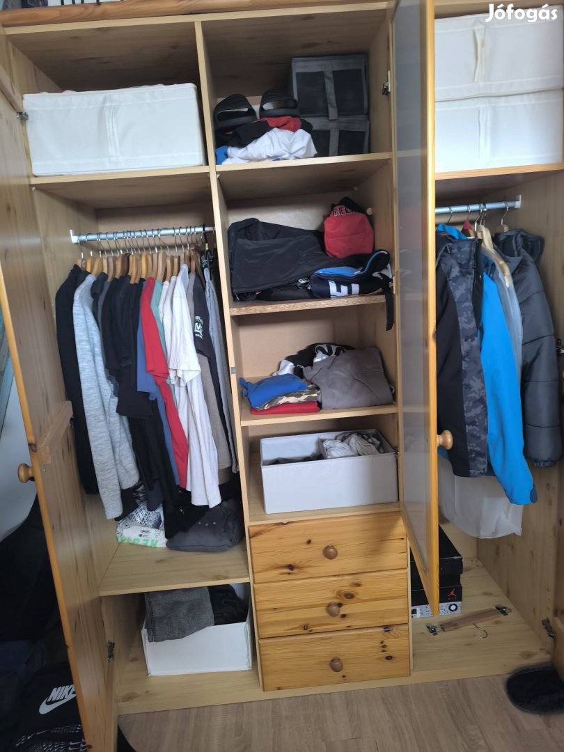 Használt, a felső fiókját vagy a felette lévő ajtót állítani kell, mert összeér. 2 plusz polcot vágattunk bele, ami nem a saját anyaga. Az oldala nem fenyő. 146 cm széles, 62 cm mély, 200 cm magas. Csak szétszerelt állapotban lehet elvinni. A szétszerelés a vevő feladata.