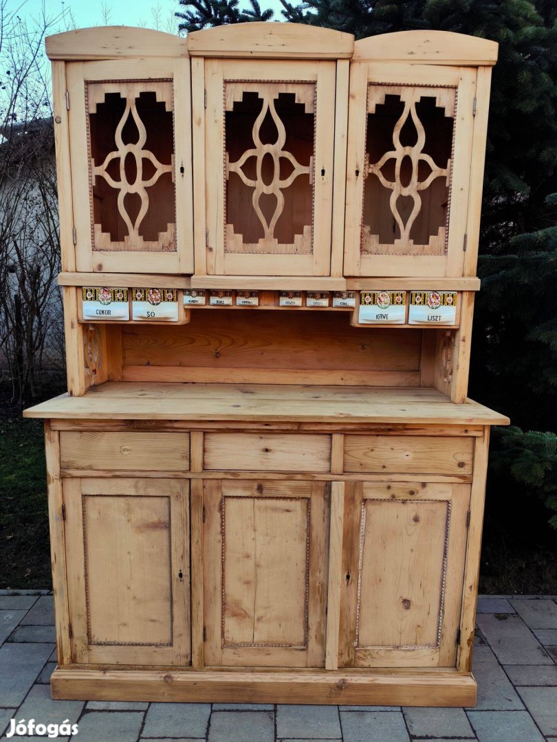 Fenyő tálaló kredenc, Hollóházi riolit fiókos, festékmart