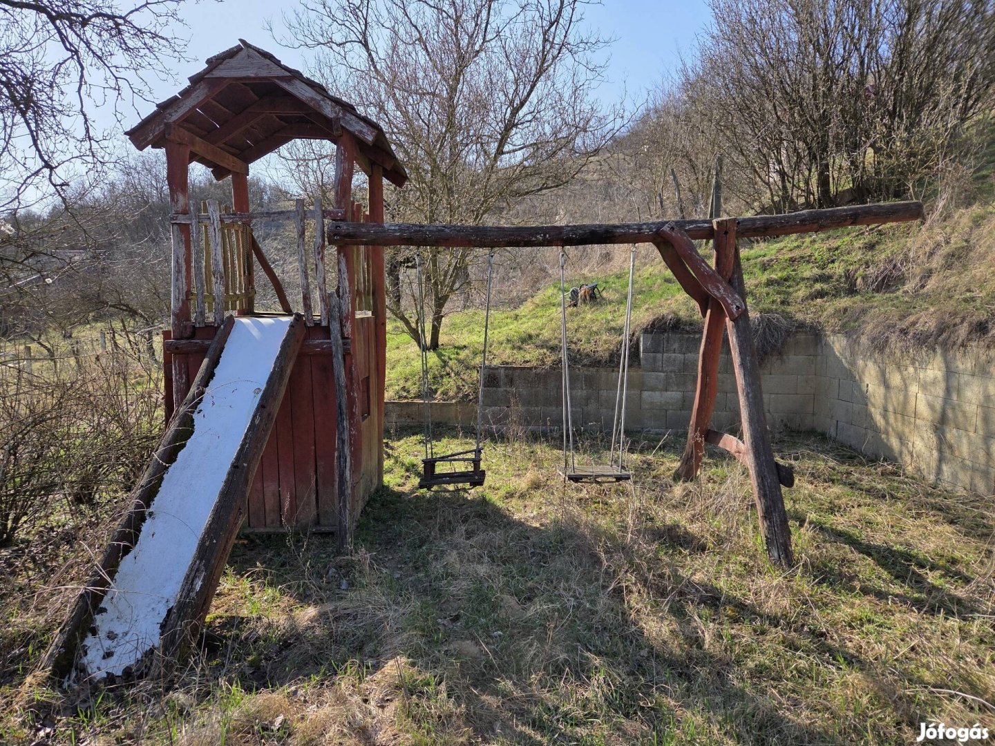 Akác rönkből készült kerti játszótér. 4 méter széles, a torony 3,3 méter magas. Hintával, csúszdával.