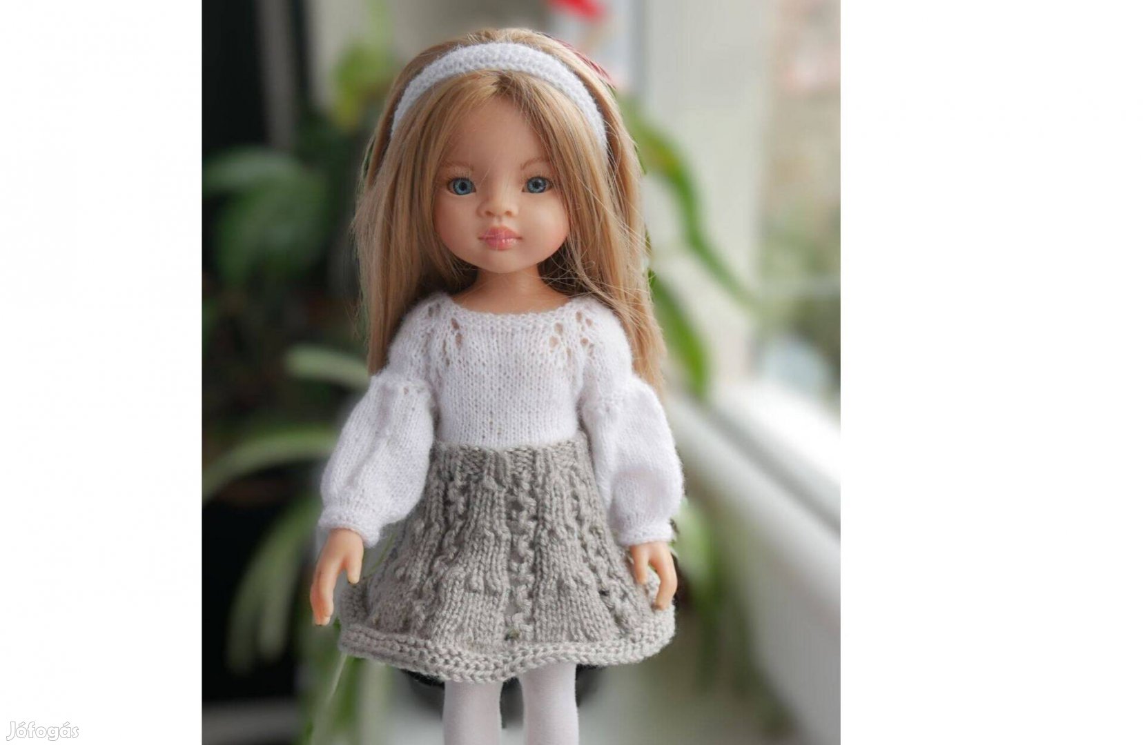 Eladó a képeken látható, új, kézi kötésű babaruha szett 32 cm-es Paola Reina babára. A szett tartalma: szürke csipkemintás körszoknya, fehér hosszú ujjú pulóver és hajpánt.