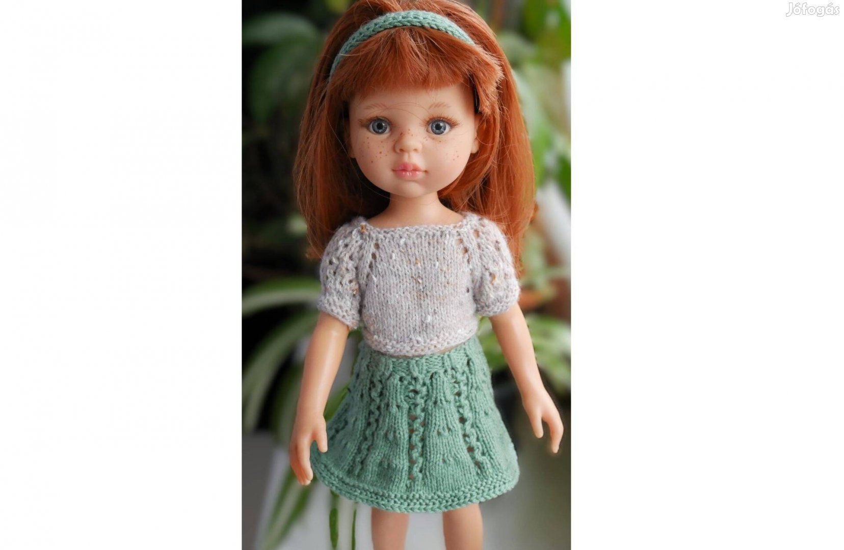 Eladó a képeken látható, új, kézi kötésű babaruha szett 32 cm-es Paola Reina babára. A szett tartalma: zöld csipkemintás szoknya és fejpánt, bézs rövid ujjú felső.