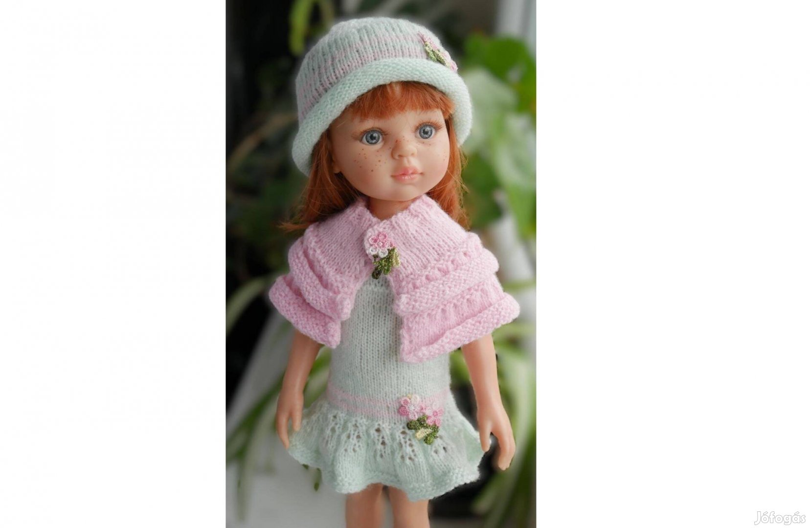 Eladó a képeken látható kézi kötésű babaruha szett 32 cm-es Paola Reina babára. A szett tartalma: halványzöld ruha és sapka rózsaszínű pelerinel.