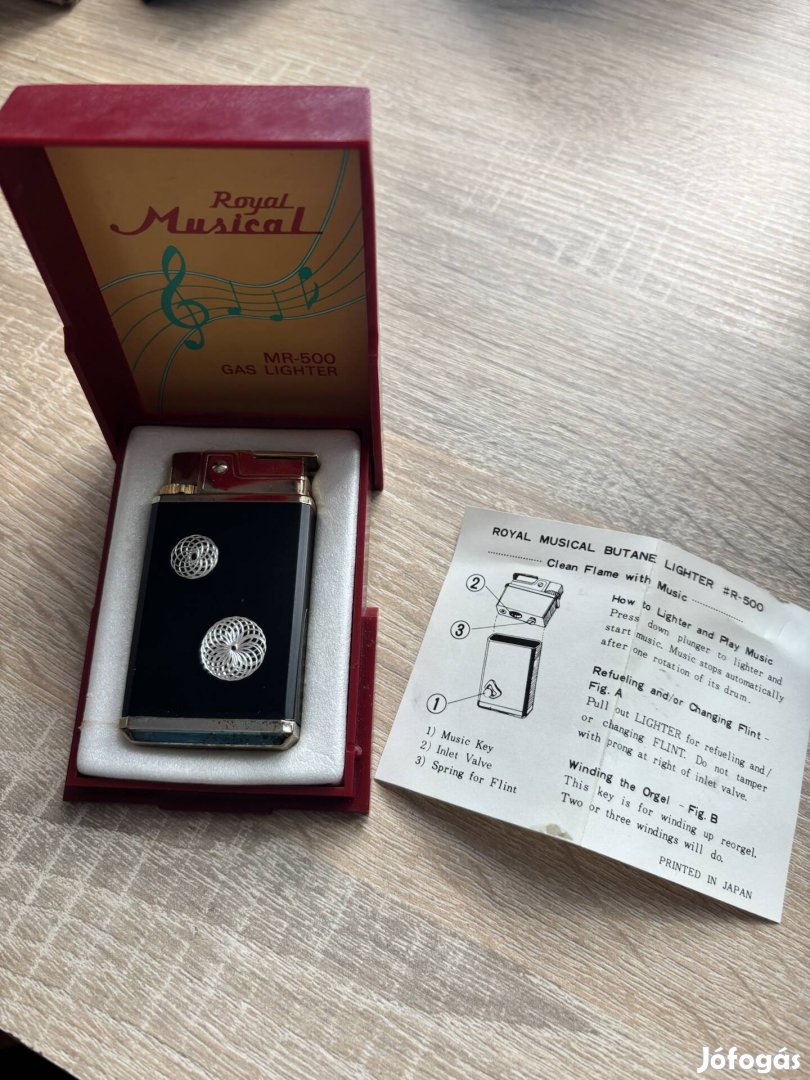 Eladó egy gyűjtői állapotú, Royal Musical MR-500 típusú gázöngyújtó az 1970-es évekből. Japán gyártmány, eredeti, hibátlanul működő Sankyo mechanikus zeneszerkezettel.