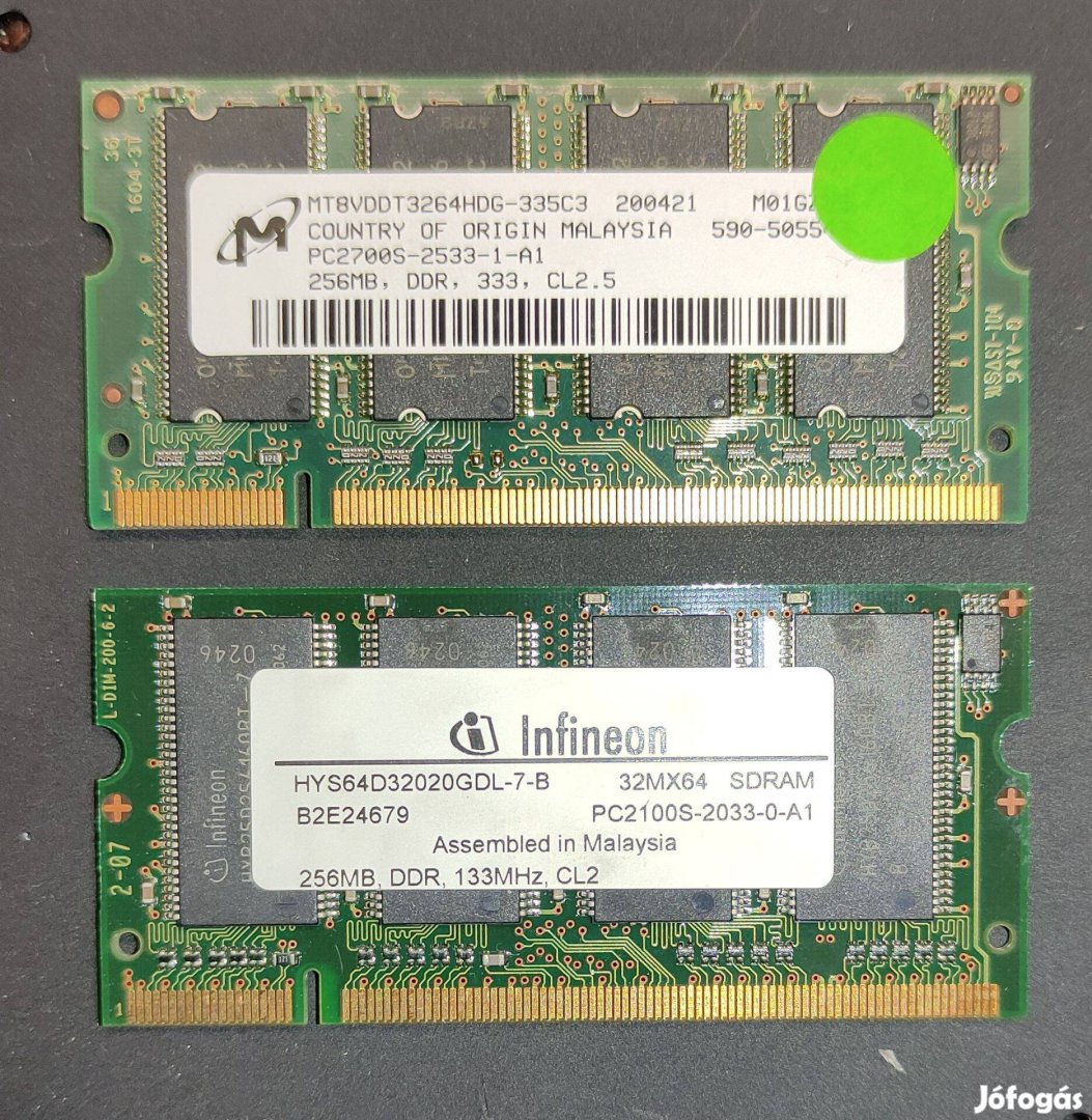 Eladó két darab DDR1-es memória modul régi típusú laptopok bővítéséhez vagy felújításához.