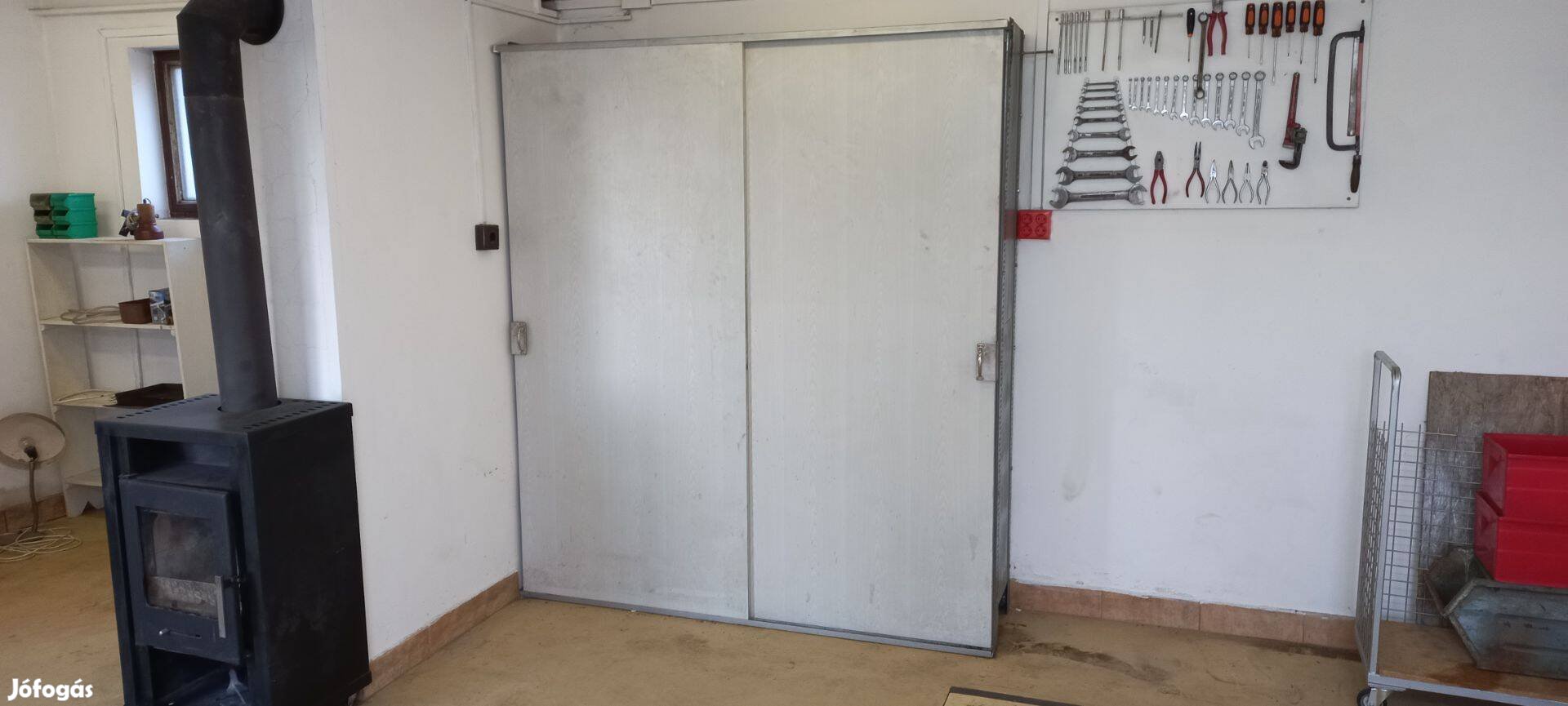 Eladó a képeken látható fehér színű, 187 cm széles, 212 cm magas, 42 cm mély, salgópolcos, két tolóajtós műhelyszekrény. Erős, strapabíró polcai vannak a szerszámok és nagyobb munkadarabok és négy fiók az apróbb tárgyak tárolásához. Használt, de jó állapotban van.