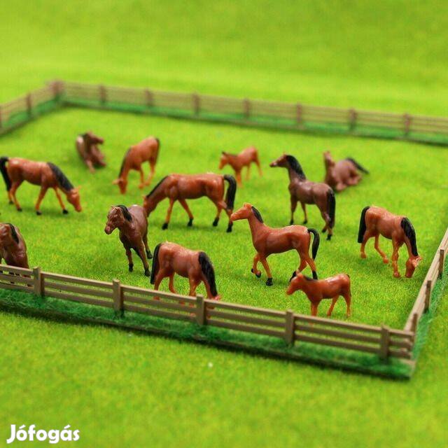A fotó illusztráció. A tényleges makettek festése kissé eltérő lehet. A karámos fotó nem a teljes csomagot mutatja, hanem annak csak egy részét. A teljes csomag 30db lovat tartalmaz. A fotón látható egyéb "tereptárgyak" (karám, fű, stb) nem részei a csomagnak.