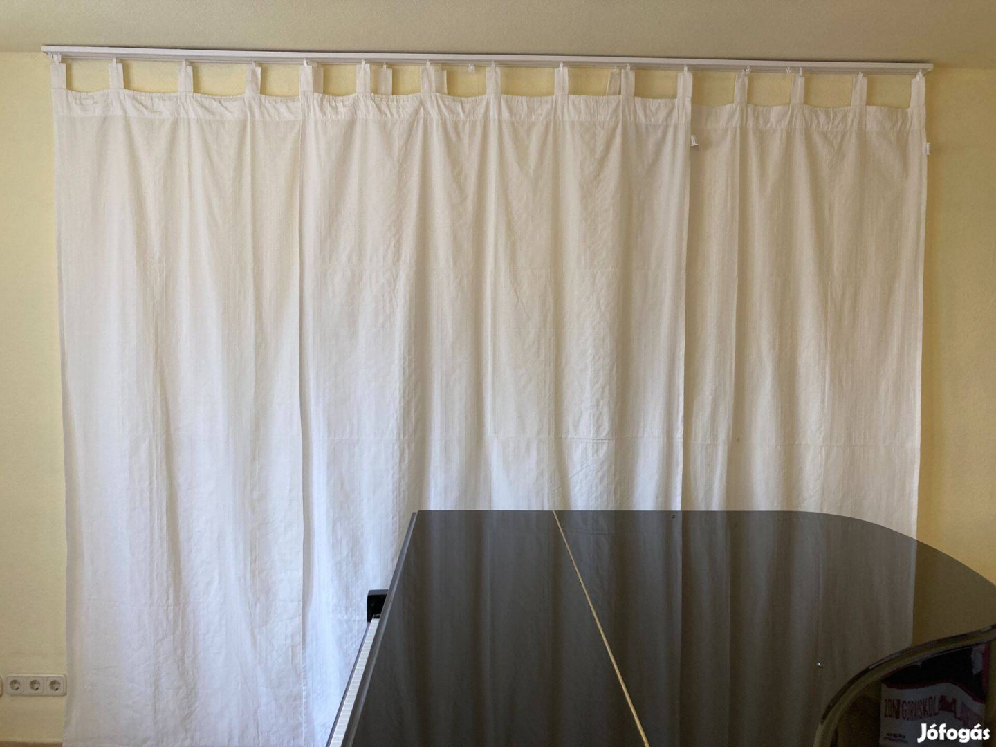3 db közepesen vastag, tört fehér függöny. Teraszajtóhoz, de akár falhoz is jó akusztikai függönynek. 140 cm széles, 240 cm magas.