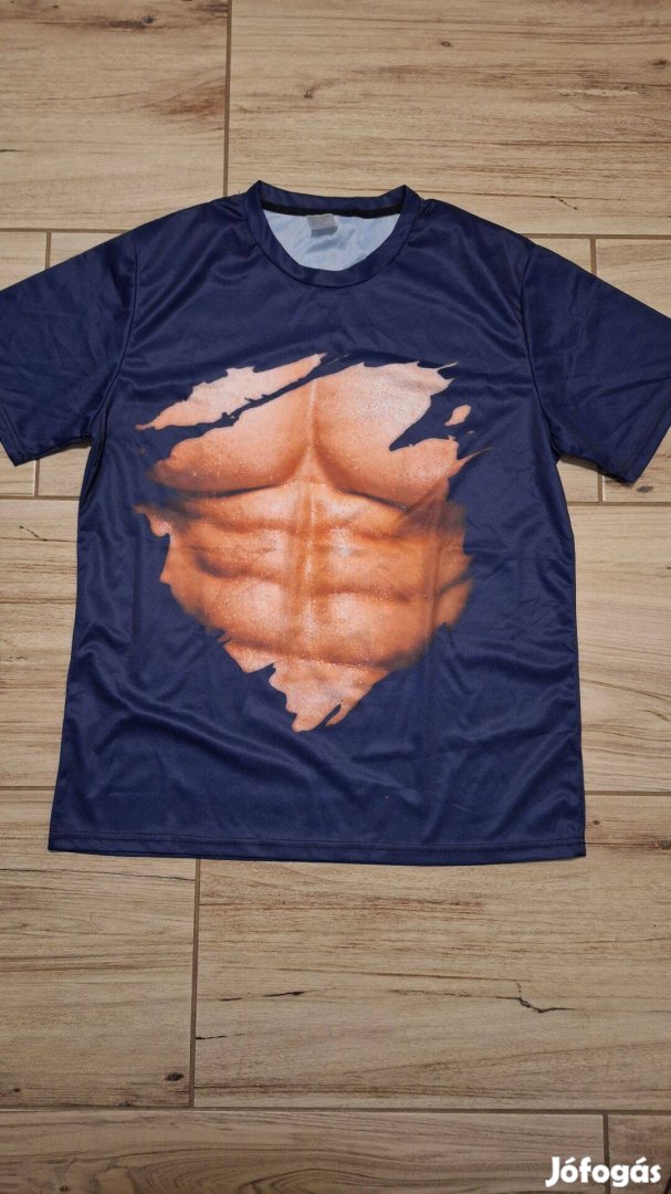 Eladó egy új, egyszer sem használt kék színű L-es rövid ujjú 3D hatású férfi póló, amelyen szakadás-minta alatt egy élethű izmos felsőtest látható.