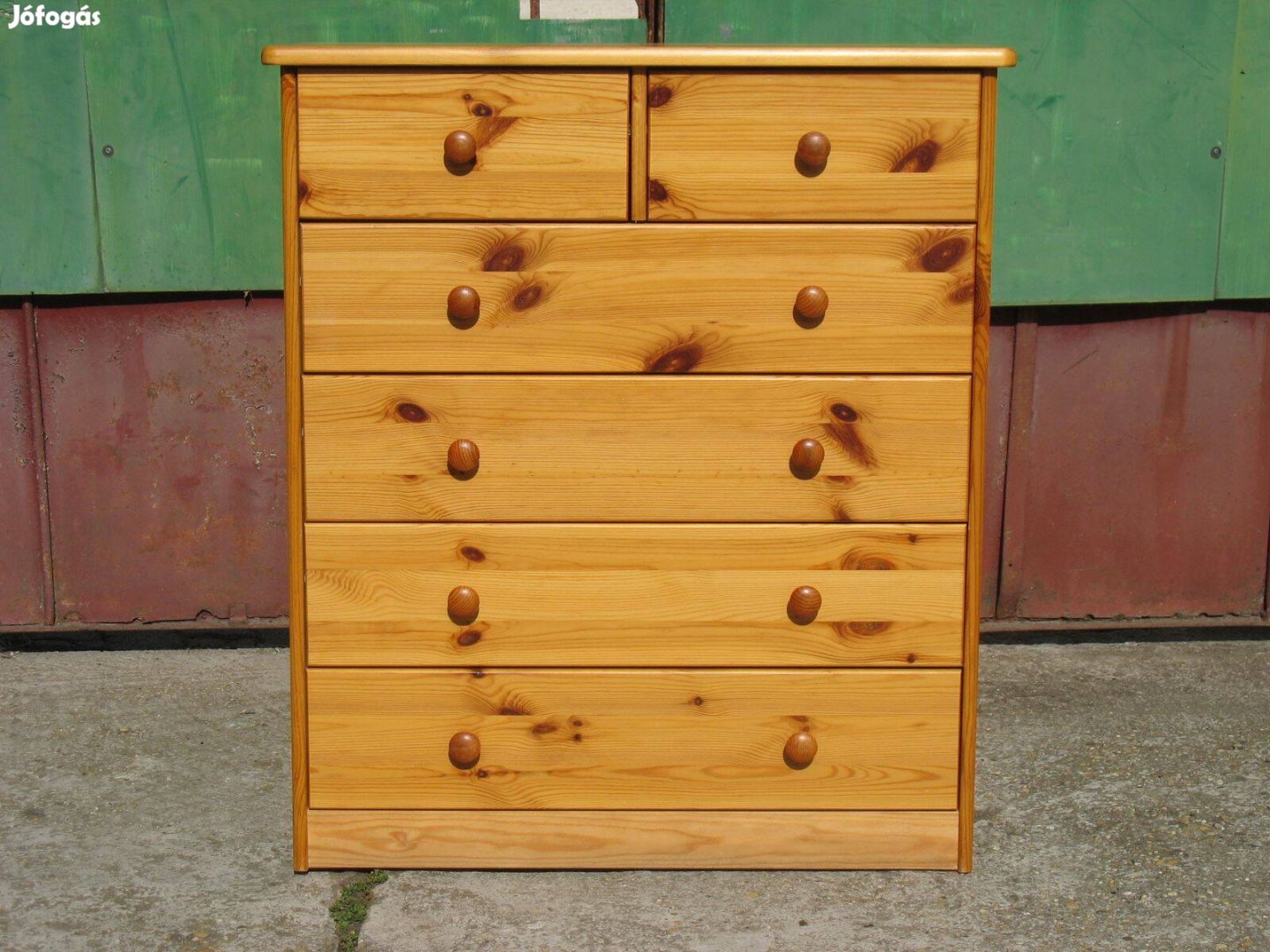 Használt, de megkímélt állapotban lévő, tömör fenyő 6 fiókos komód. A fiókok szépen működnek és tiszták.