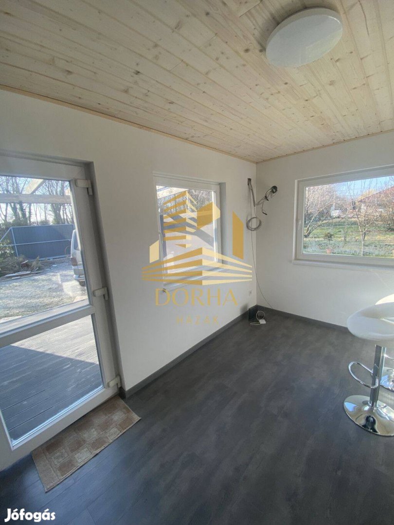 A komfortot padlófűtés garantálja, amit WiFi-s termosztáttal szabályozhatsz, a nyári melegben pedig a beépített klíma gondoskodik a hűs levegőről. A fürdőszoba teljesen felszerelt, a ház többi része viszont bútorozásra vár - így saját ízlésed szerint rendezheted be!