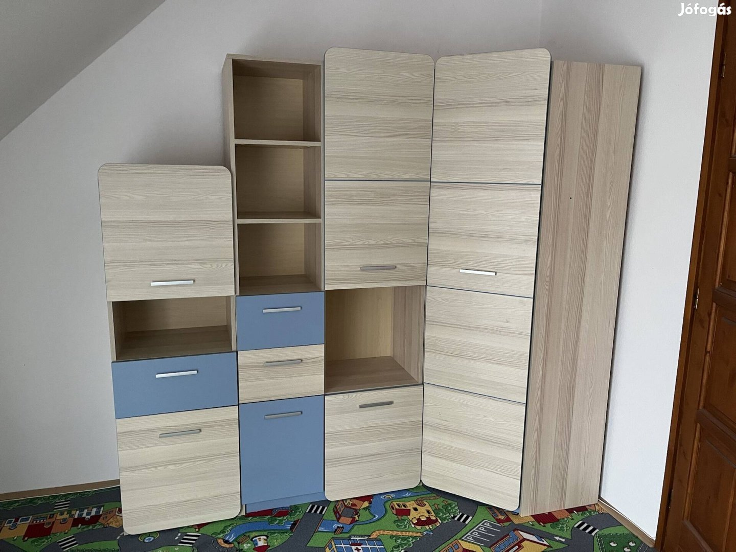 Szép állapotú, nem összematricázott, karcolt bútorok. 4 részes, sarokszekrény akasztós résszel, mellé két állószekrény, polcos, ajtós és fiókos kialakítással. Plusz egy komód fiókokkal és ajtós résszel. Méretek a fényképek között.