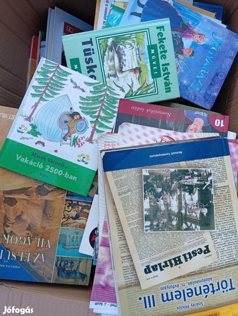 Eladó 60 darabos vegyes könyvcsomag, amely tartalmaz tankönyveket, mesekönyveket, ismeretterjesztő könyveket etc.