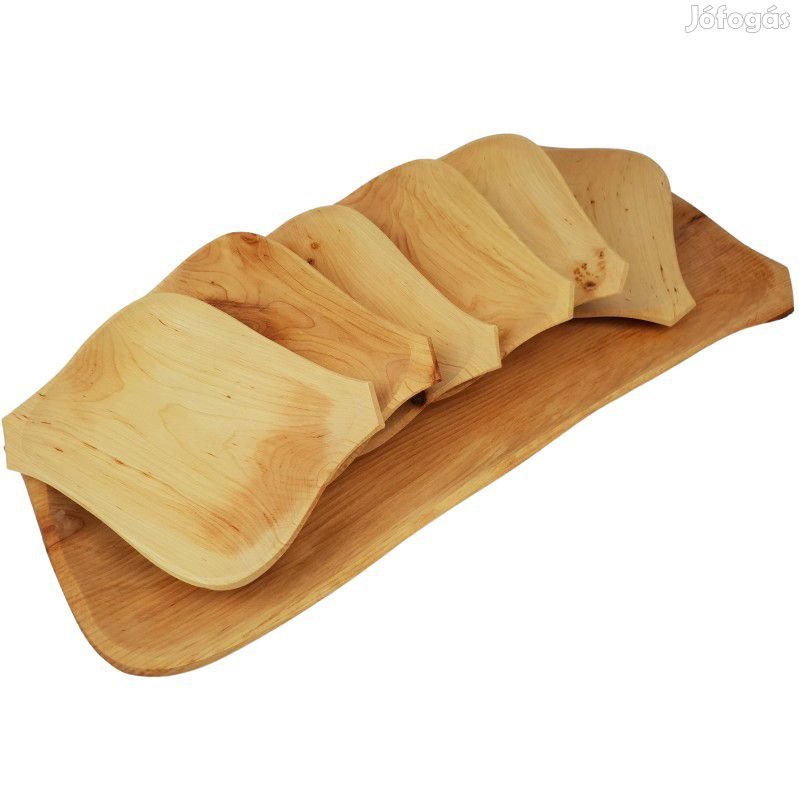 7 részes fatányér készlet égerfából vagy cseresznyéből faragott , 6 személyes, méretei kb 23 × 17 cm-es tányérral és kb 60 × 24 cm-es, hármas osztású kínálóval.