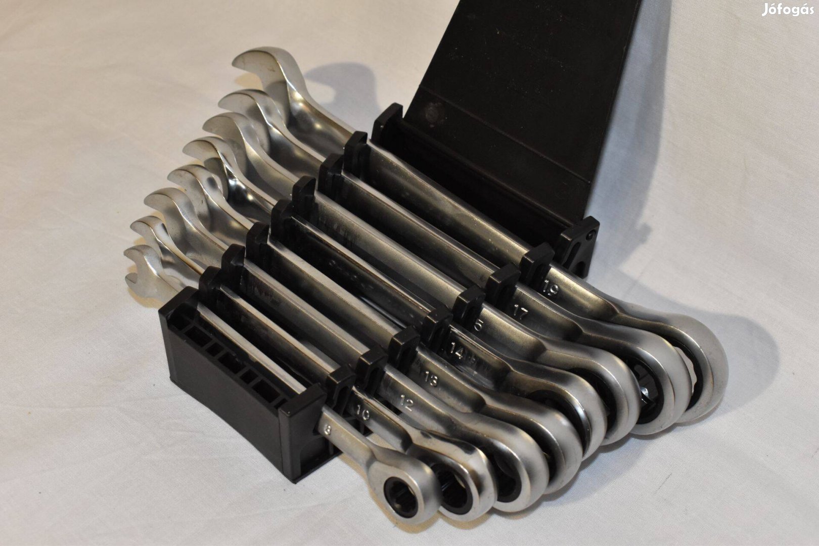 8 db-os chrome-vanadium racsnis villáskulcs készlet, praktikus tartóval amit akár falra is lehet szerelni.