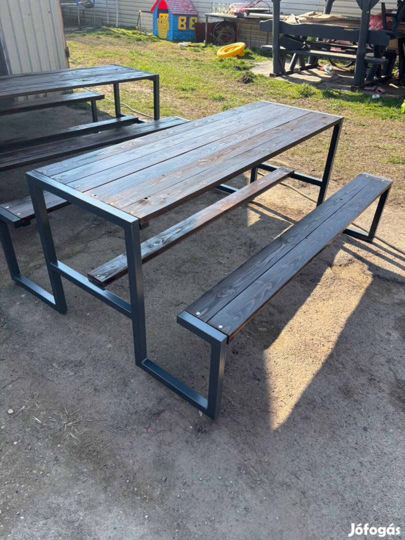 Eladó a képen látható masszív, egyedi készítésű kerti asztal két paddal. Stabil acél vázzal készült, a fa részek gondosan csiszolva és kezelve vannak, így kültéri használatra is tökéletes.