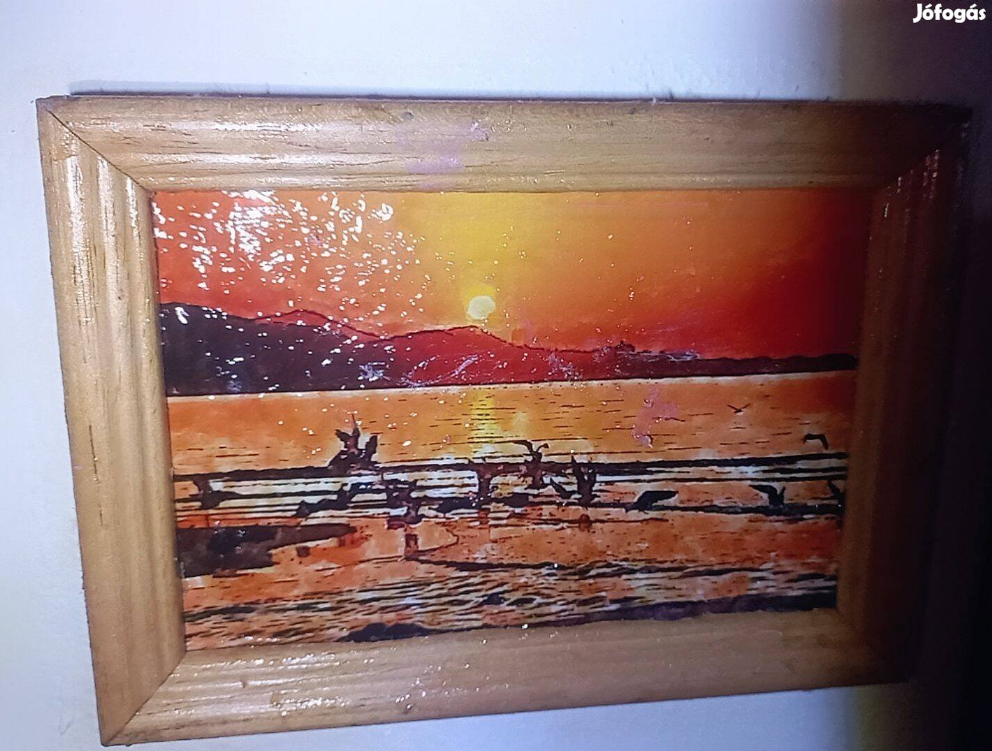 Nyári Kép.Tengerpart.Madarakkal.Naplemente.Kép-Festmény.Fakeretben.