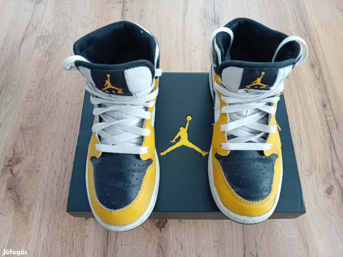 Eladó egy alig használt nagyon jó állapotban lévő Air Jordan 1 Mid 38 -as fiú cipő, fehér alapon citromsárga és fekete berakásokkal.