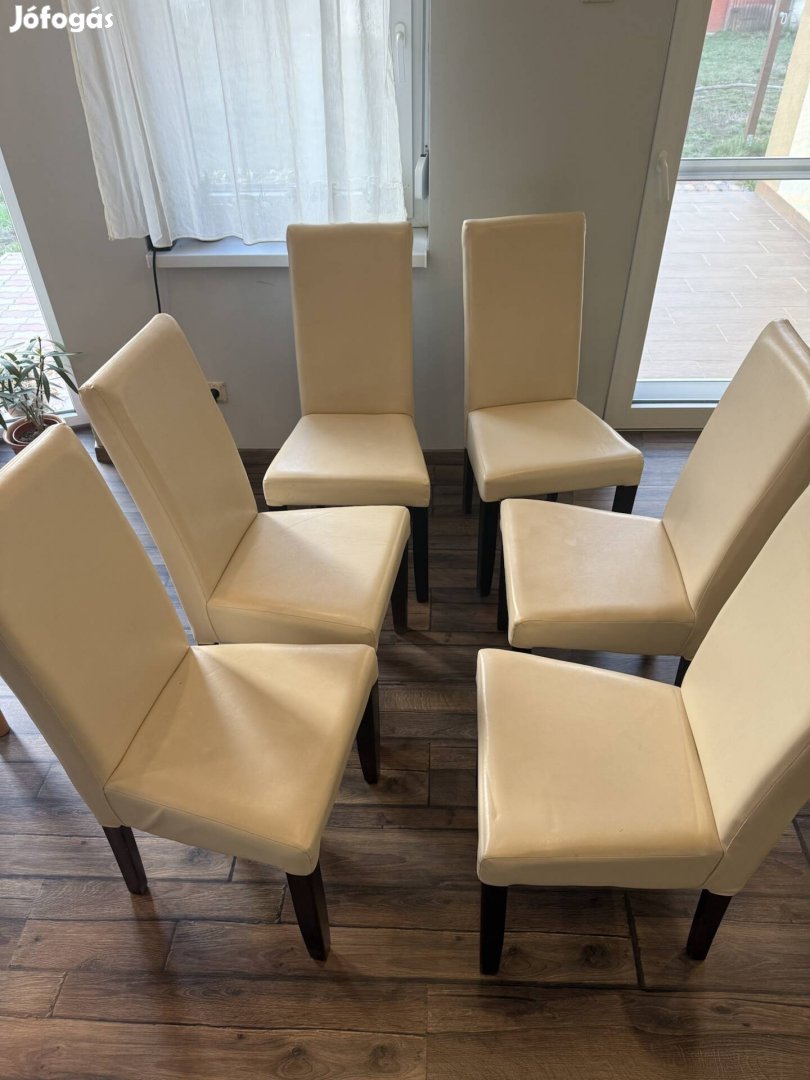 6 db krémszínű textilbőr szék, kiváló állapotban. A lábak picit kopottak, ahogy a fotókon is látszik. Együtt eladó áron alul.
