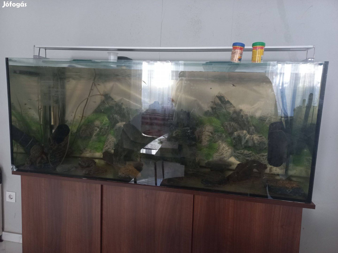Eladó a képen látható akvárium 500 l szekrénnyel világitással neon halacskákkal és 2db vitorlás halacskával .