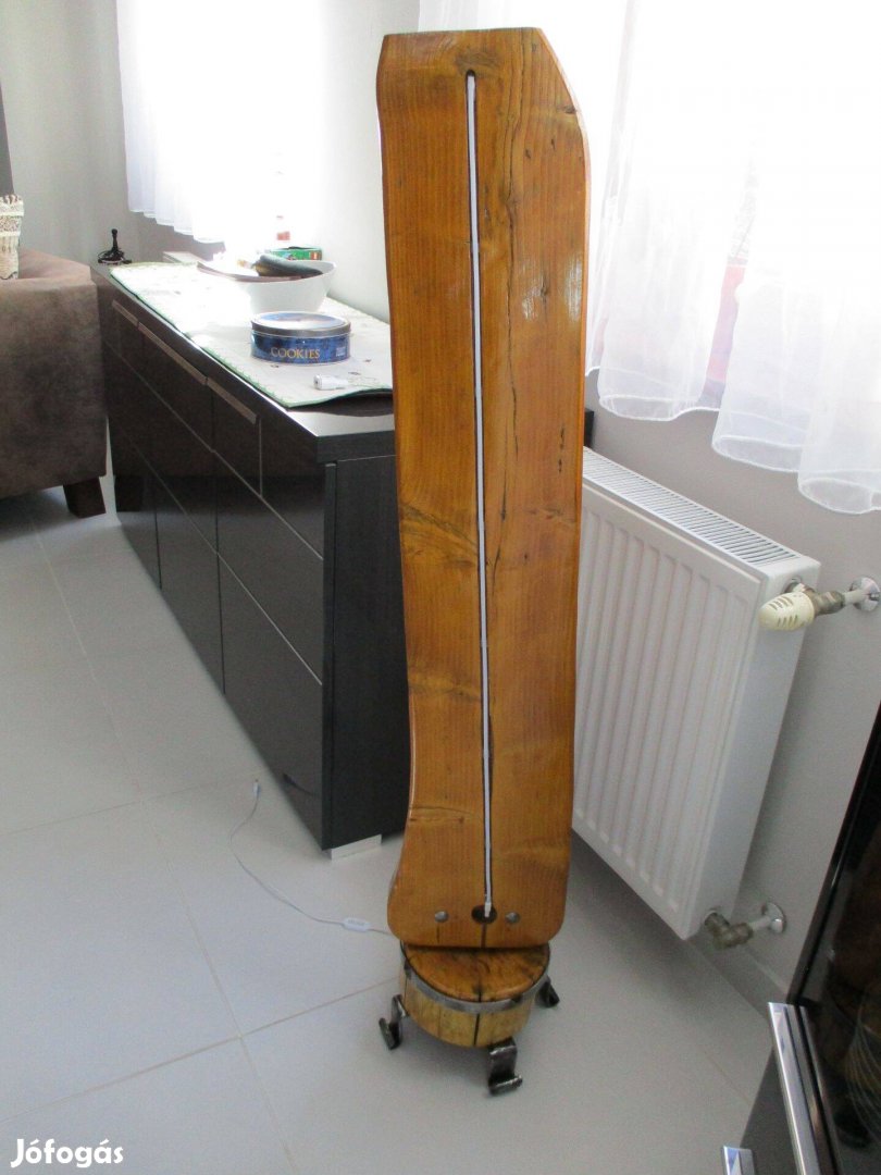Fából készült, magassága kb 140 cm. Fordítható, nagyon kellemes esti fényt ad egy nagyobb nappaliban is.